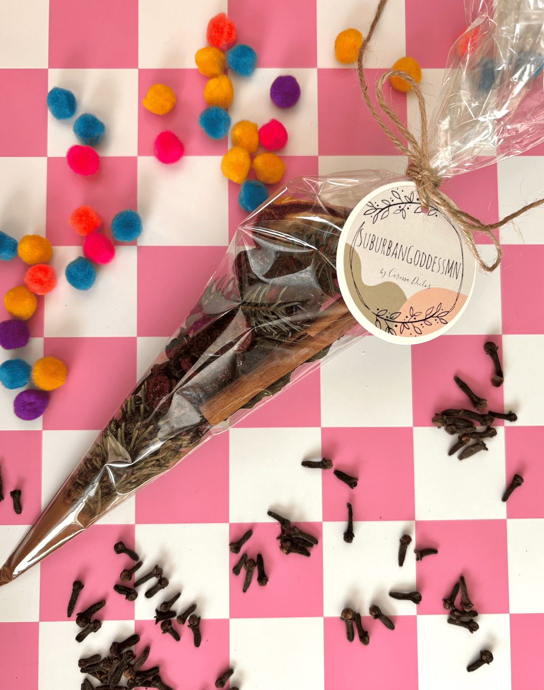 contains sprigs of pine, dehydrated oranges, cinnamon sticks, ground cinnamon, whole cloves, dried cranberries, and black peppercorns.