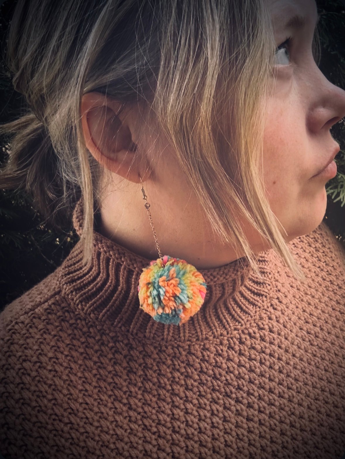 handmade yarn earrings with gold accents. 4" dangle from top of hook to bottom of pom