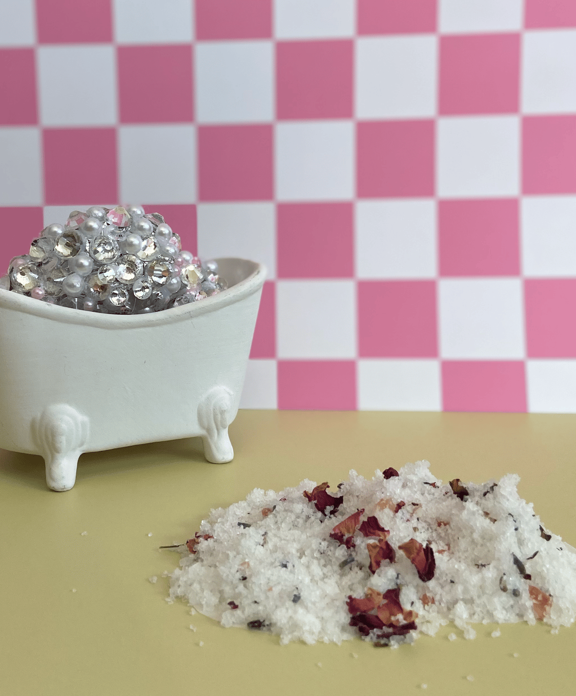 ingredients: epsom salt, pink himalayan salt, lavender essential oil, baking soda, lavender buds, rose petals, rose quartz crystals